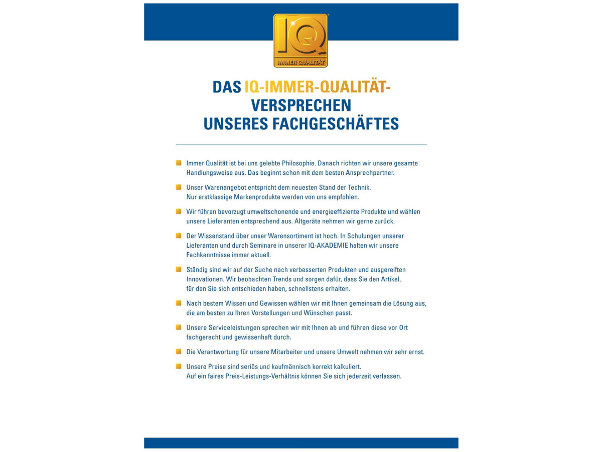 IQ – Immer Qualität. Das ist nicht nur unser Versprechen an Sie. Das ist auch der Anspruch, den wir selbst an uns als Fachhändler stellen.