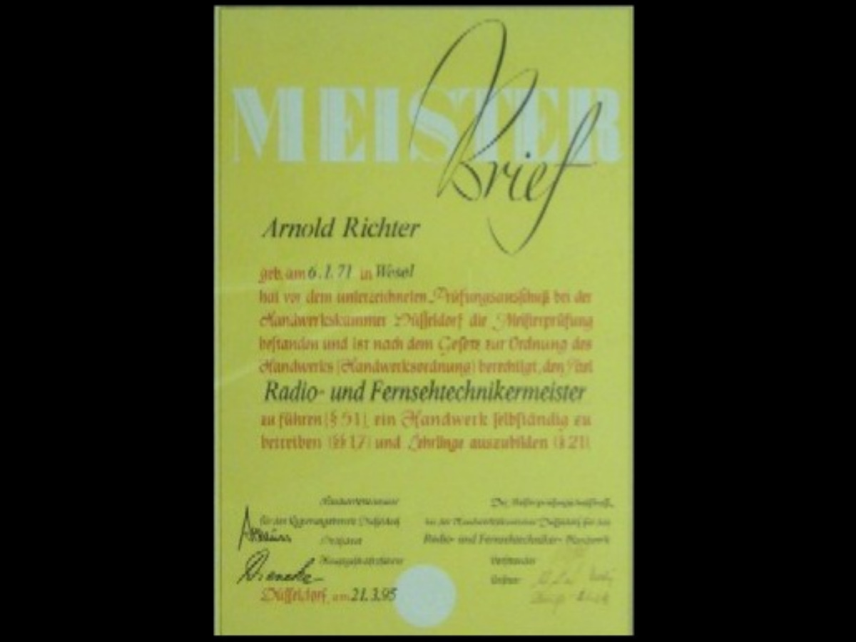 Nach Abschluss der Realschule Wesel-Mitte 1987 fiel die Entscheidung, in die Fußstapfen des Vaters Gerhard Richter zu treten und den Beruf des Radio- und Fernsehtechnikers zu erlernen. So begann auch die Ausbildung im elterlichen Betrieb, um von Anfang an die Philosophie des Unternehmens zu erlernen und in Zukunft beizubehalten. Nach erfolgreichen Abschlüssen der Ausbildung im Januar 1991 und der Meisterschule an der Handwerkskammer Düsseldorf im März 1995, erfolgte die Betriebsübergabe von Gerhard Richter auf seinen Sohn Arnold Richter am 1. Januar 2000.